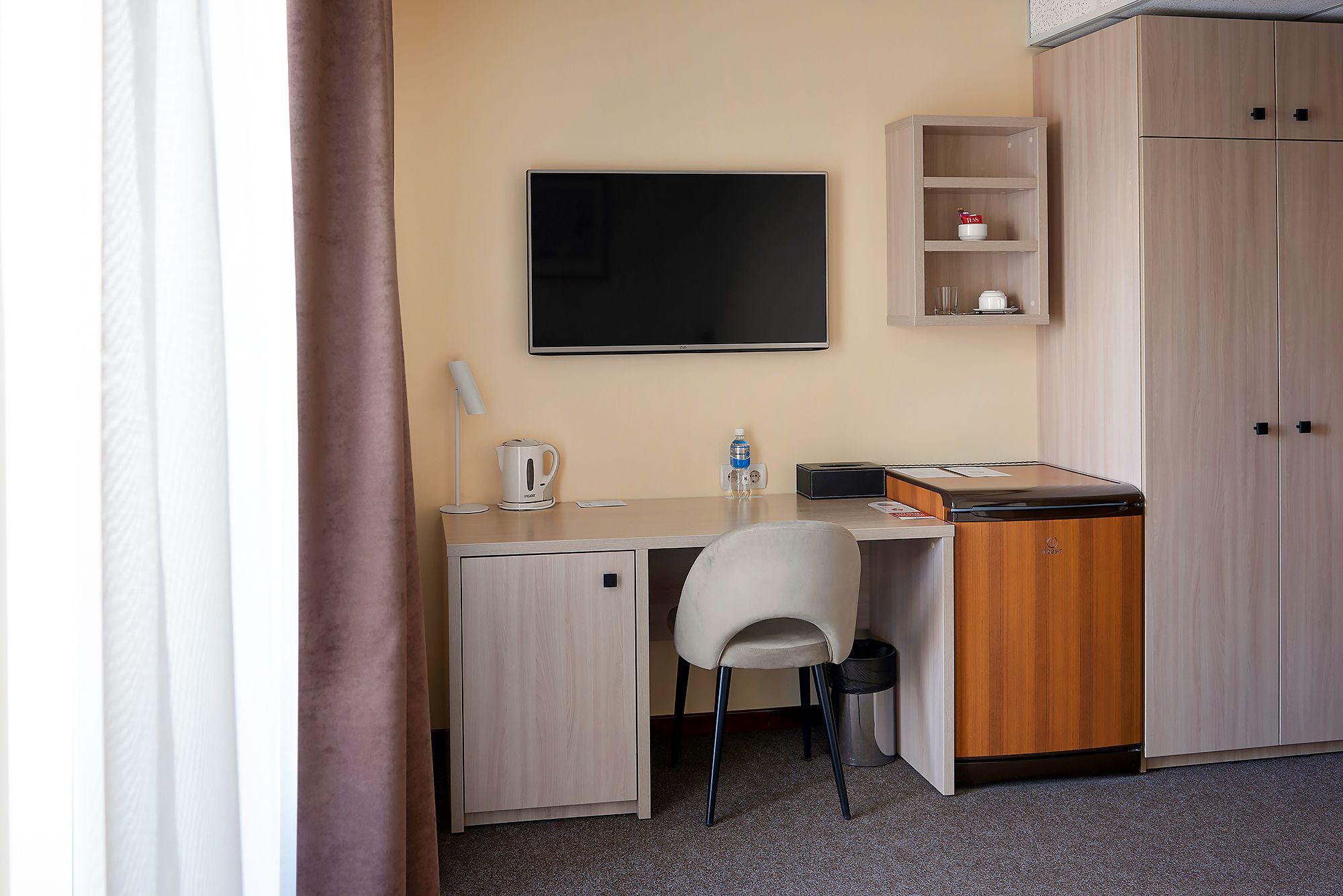 Стандартный одноместный номер - это номер площадью 17, 5 м2 с одной 1,5-спальной кроватью, рабочей зоной и ванной комнатой. В номер может быть предоставлена детская кроватка размером 70 х 125 см. В некоторых номерах имеются балконы.